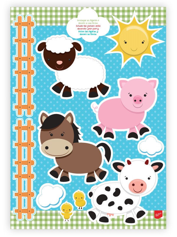 Kit Decorativo Fazendinha de papel cartonado com 2 lâminas (1 inteira e outra com personagens e cerca recortados).Ideal para colar na parede e fazer enfeites de mesa.